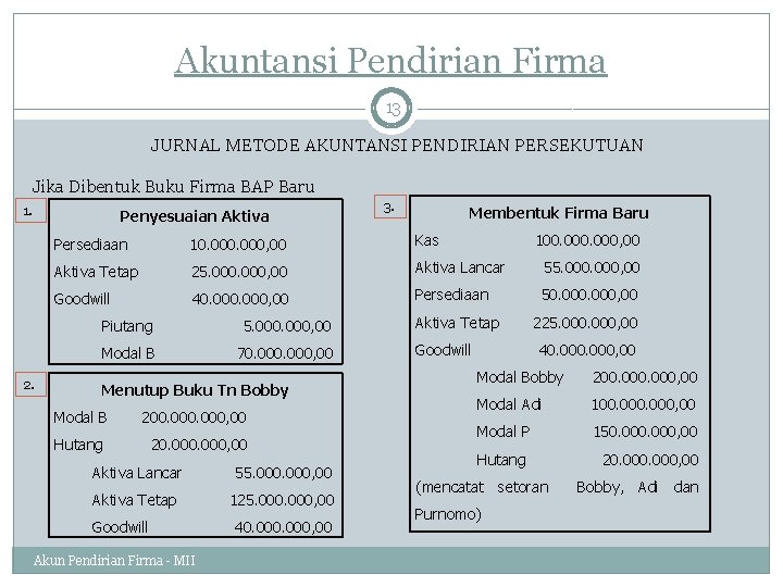 Contoh soal akuntansi firma akuntansi untuk perubahan pemilikan firma. Salah satu bentuk persekutuan yang sering dilakukan adalah dalam bentuk firma. Badan usaha perseorangan (proprietorship), yaitu badan usaha yang dimiliki oleh satu orang. Contoh soal akuntansi koperasi simpan pinjam. (k) ikhtisar laba rugi rp 15.000.000. Uang tunai (kas) sebesar rp.5 juta dan peralatan komputer dengan harga perolehan rp.750 ribu dan nilai pasar rp. Contoh soal akuntansi pembentukan persekutuan terjadi ketika kakraffi memutuskan bekerjasama membentuk firma. Didalam persekutuan pemisahan pemilik dan manajemen hampir tidak ada namun demikian penyelenggaraan akuntansi harus berpedoman pada ketentuan ketentuan yang diatur oleh prinsip prinsip yang lazim. Contoh soal dan jawaban uas akuntansi keuangan lanjutan i. Contoh laporan keuangan persekutuan dapat dilihat dan dipelajari pada bmp pengantar akuntansi modul 6 kegiatan belajar 1. Siska diterima sebagai sekutu baru dengan menyerahkan barang dagang sebesar rp. Contoh soal pencatatan pemebentukan persekutuan dengan metode buku baru dan lama. Uang tunai (kas) sebesar rp.2.000.000, perangkat lunak komputer dengan harga perolehan rp.10.000.000 dan nilai pasar rp.7.500.000.