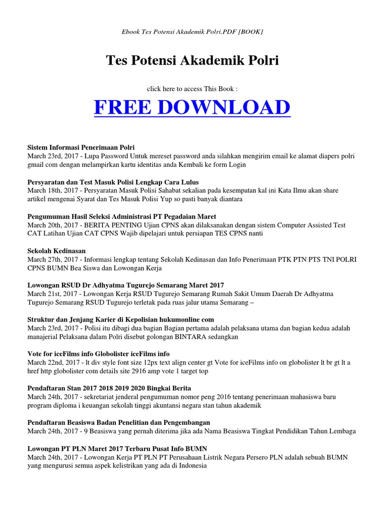 Berikut ini adalah termasuk dalam sumpah dan janji anggota polri setelah seorang calon anggota polri lulus pendidikan pembentukan, yaitu : 20210209 contoh soal tes akademik polri 2018 dan kunci jawaban demikian informasi yang dapat kami bagikan mengenai contoh soal tes 1254b32489 contoh soal tes akademik polri 2018 dan kunci jawaban. 13 reasons why free pdf download | jay asher de leon. epub soal akademik polri pdf book is the book you are looking for, by download pdf soal akademik polri book you are also motivated to search 7th, 2021download soal psikotes polri dan jawabannya pdf filejawabannya pdf written by. Tes akademik polri atau sering disebut tes potensi akademik (tpa) polri merupakan bagian penting dalam seleksi masuk polri.
