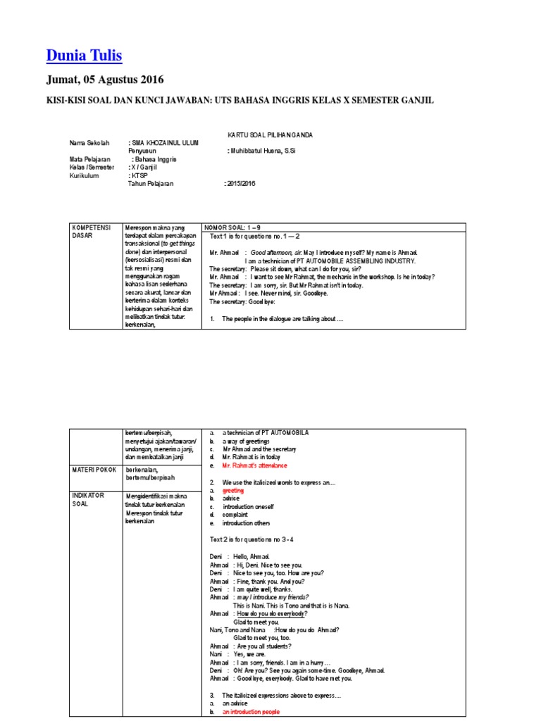 Lathihan soal bahasa inggris untuk sma kelas 10deskripsi lengkap. Silahkan dikerjakan dan temukan jawabannya. 6 nov 2019 kisi kisi soal penilaian akhir semester 1 bahasa indonesia kelas xii sma ma mata pelajaran bahasa. Contoh soal essay bahasa inggris kelas viii. Contoh soal pts bahasa inggris kelas xi mipa sma / ma.
