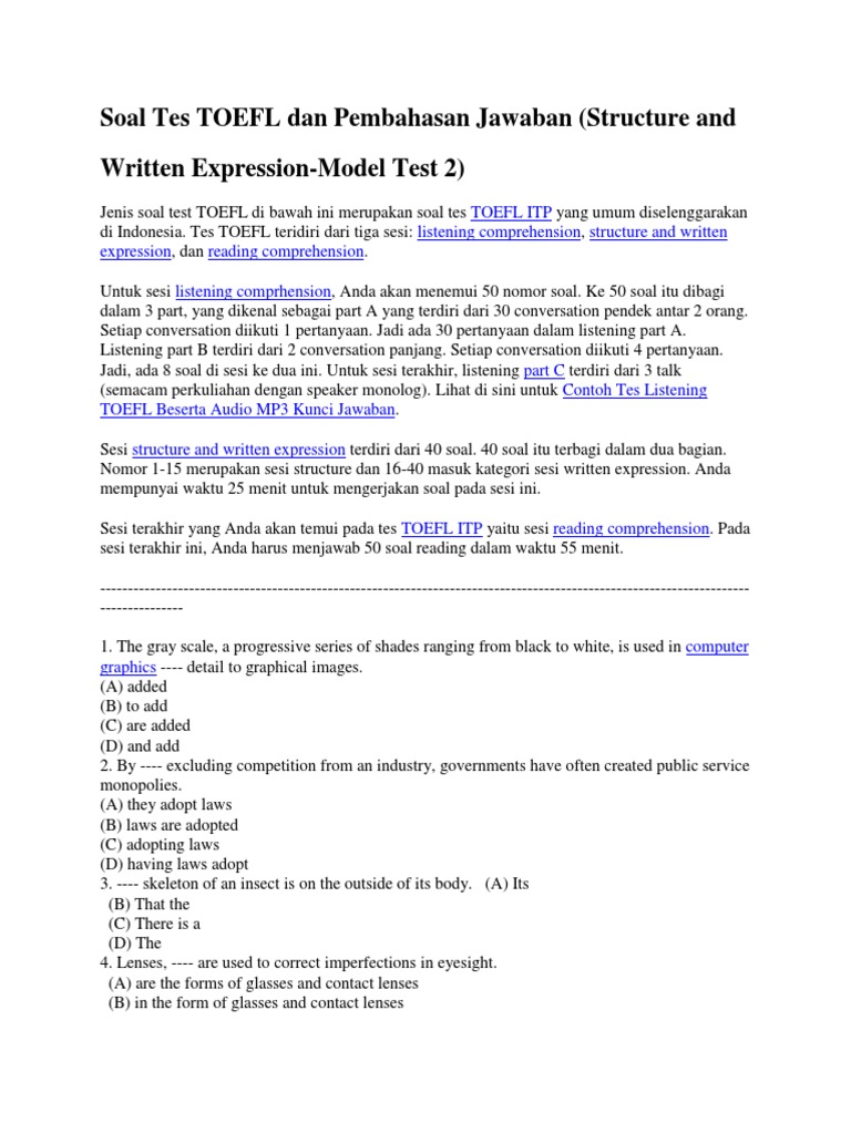 Kesalahan yang sering dilakukan saat tes listening toefl. Sebagai aparatur negara, calon pegawai negeri sipil wajib menguasai bahasa inggris sebagai bahasa. Tes kecakapan berbahasa inggris ini biasanya diikuti oleh mereka yang ingin bekerja maupun melanjutkan negara yang mensyaratkan sekor toefl tertentu bagi pelajar asing salah satunya dalah amerika serikat. Kunci jawaban toefl practice test eli gmu housing pusatnya download soal gratis toefl practice test sumber : Toefl by i20fever yathapu consulting pvt ltd issuu sumber. Berikut ini bentuk contoh soal tes toefl structure and written expression. Kunci jawaban test pelajari dasar bahasa inggris untuk pemula bagian 1 (toefl part 1) dividio kali ini aku akan memberikan. Biasanya tes ini diperlukan untuk proses regristrasi masuk perguruan tinggi dalam atau luar negeri.
