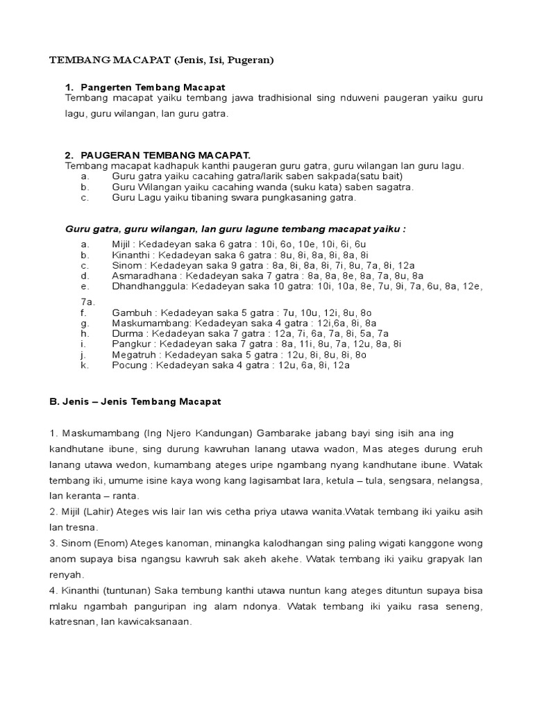 Diera globalisasi, zaman berkembang sangat cepat dan kesenian budaya daerah mulai kehilangan pamornya. Paugeran atau aturan tembang gambuh. Tembang gambuh (paugeran, cakepan, arti tembung lan pitutur saka tembung) lengkap kali ini saya share tentang materi bahasa. Salah satu kesenian warisan budaya yang ada di. Guru gatra yaiku cacahing gatra utawa larik saben sapada ing tembang macapat.