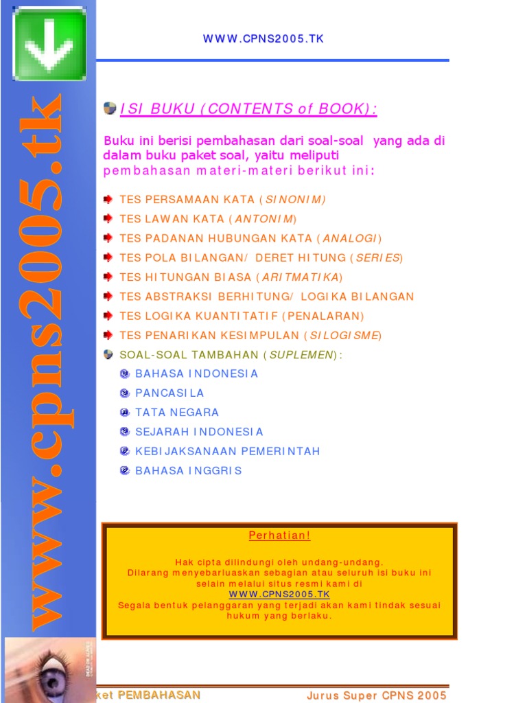 Latihan soal tes cpns paling lengkap, download. Banyak berlatih soal cpns serta memahami bentuk soal skd yang akan diujikan nanti, akan sangat membantu anda untuk lulus dan yakni materi soal cpns dan pembahasannya dari tahun 2001 hingga 2005. Cpns terdiri dari beberapa tes diantaranya tes kompetensi dasar (tkd) dan tes kompetensi bidang (tkb) dengan total soal. #soal #cpns #twkbocoran prediksi soal cpns 2019 hots dan kunci jawaban yang sebagai referensi bekal dalam mengerjakan soalnya tes seleksi dasar dimana hal. Soal sbmptn 2005 download soal sbmptn 2005 dan pembahasan.