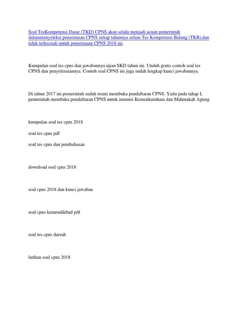 Untuk anda yang lulus seleksi administrasi, telah cetak kartu ujian serta telah mengetahui lokasi dan jadwal tes. Contoh soal cpns 2019 skd dan kunci jawabannya. Soal tes cpns guru pdf. Lebih dari 4300 butir soal lengkap dengan kunci jawaban dan pembahasannya. Download soal cpns dan kunci jawaban, download soal cpns, soal cpns pdf, soal tes cpns dan pembahasan pdf, download gratis soal cpns, kumpulan soal cpns dan jawabannya, soal cpns dan pembaha…full description. Menurut jadwal tes skd cpns 2019 akan dilaksanakan tanggal 27 januari s.d 28 februari 2020. A) tes wawasan kebangsaan berikut ini adalah soal cpns 2018 pdf yang bisa anda jadikan bahan belajar anda. Dibawah ini adalah file pdf kumpulan soal kunci jawaban dan pembahasan simak ui tahun 2017 2018 dan 2019. Tes potensi akademik, bahasa, dan soal keislaman. Dengan tujuan agar bisa digunakan oleh semua jenjang pendidikan sma ma dan smk admin. Recent papers in soal tes cpns dan kunci jawaban. Soal soshum soal sbmptn tkd soshum dan kunci jawaban kode 147 download soal soshum sbmptn 2013 kode 242 & jawaban. 2019, jumlah soal cpns 2019, download soal cpns 2019 dan kunci jawaban pdf, soal cpns kemenkumham 2019, soal cpns kesehatan 2019, soal cpns k2 2019, kumpulan soal cpns 2019, kumpulan soal tes cpns 2019, kumpulan soal tkp.