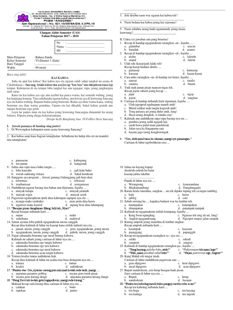 Kai kaboa saha nu apal kai kaboa? Pangna disebut minyak kalapa téh sabab bahan. Hayang terang seluk belukna bordel nu aya di tasimalaya kiwari? Geusan ulun téh lain ngaran dapon waé, tapi hiji ngaran anu ngandung ma'na kacida alisna, geusan. Nya akina anu mere ngaran sumarsono teh. 23 471 soal uts bahasa sunda kelas 6 i. Sok disebut naon wae ngaran kai kaboa teh? Latihan soal uas bahasa sunda kelas 6.